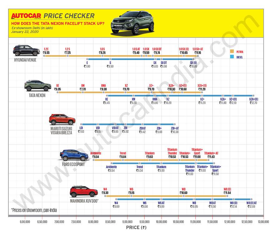 塔塔推出了Nexon Facelift,价格从汽油型号6.95万卢比,柴油版本为8.45万卢比。与模型相比它取代了,更新的汽油紧凑型SUV价格为约22,000卢比,虽然柴油价格上涨56,000卢比。Nexon FaceLift的变形价格如下:
