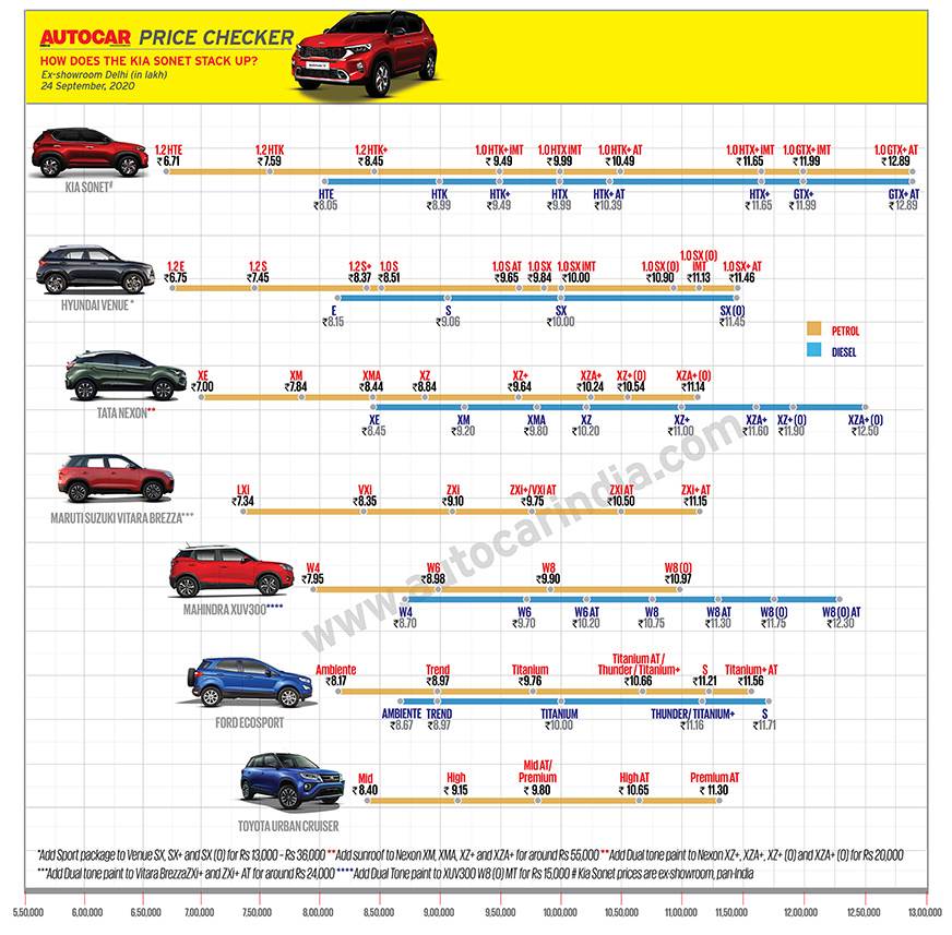 与紧凑型SUV段的竞争对手相比,城市巡洋舰既不是最昂贵的也不是最实惠的,但它的价格低于Mahindra Xuv300和福特Ecosport,总体而言。丰田的成本只是Vitara Brezza的比例超过了vitara brezza,而且价格的中间规范版本,塔塔Nexon和Hyundai地点也价格为低于较低的工作表明,现代化的地点涡轮价格从8.51万卢比开始,这略高于基础城市巡洋舰和Mid-Spec Vitara Brezza。Tata Nexon拥有最实惠的自动变体,也是天窗的最实惠的模型。
