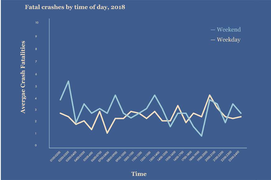 在平日期间,致命崩溃的高峰期是20:00 - 21:00,而周末峰值期在02:00至03:00之间。