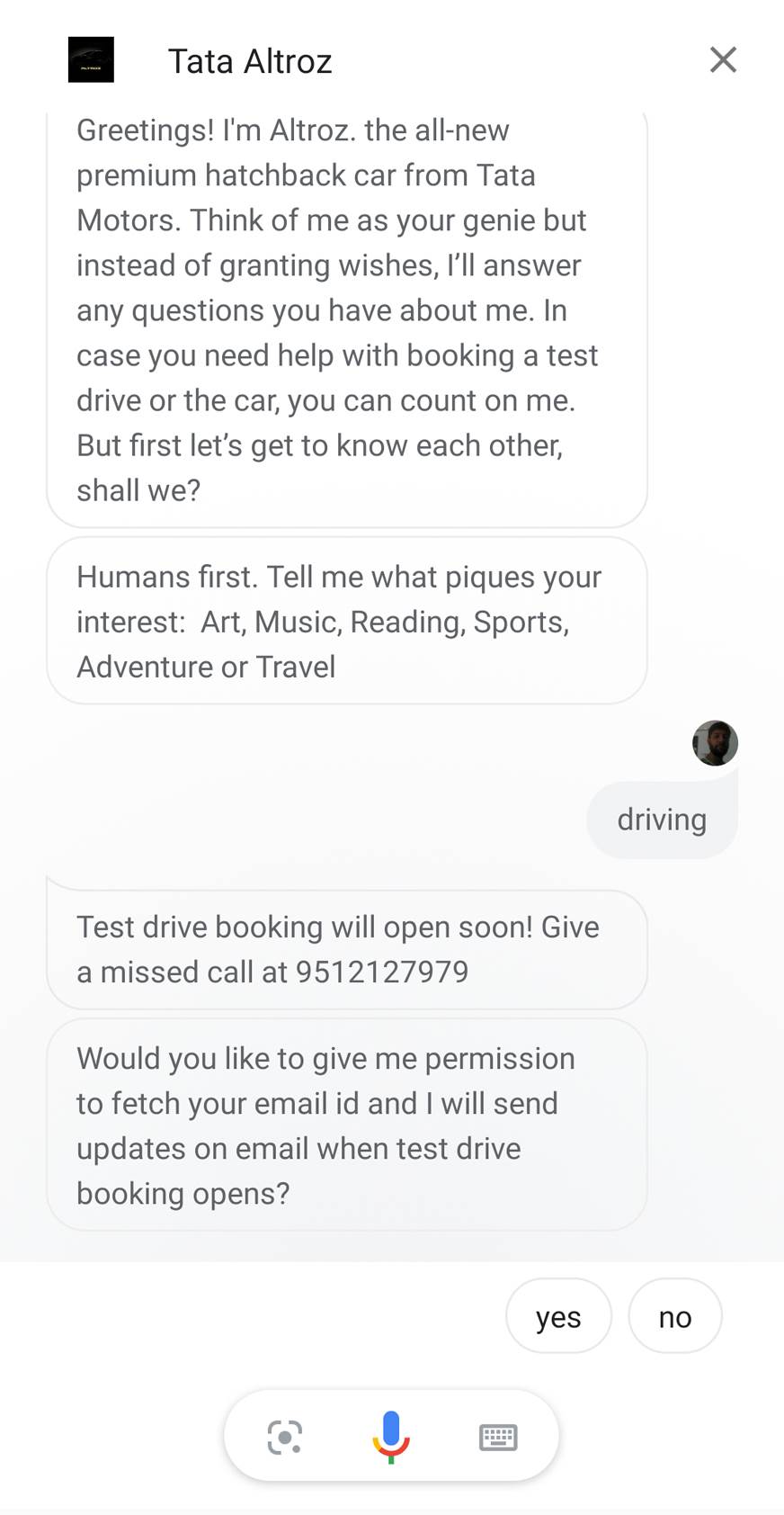 Tata altroz语音机器人,它响应被汽车名字调用,还可以预订测试驱动器,让您知道经销商何时能够提供该服务,使其更方便注册。