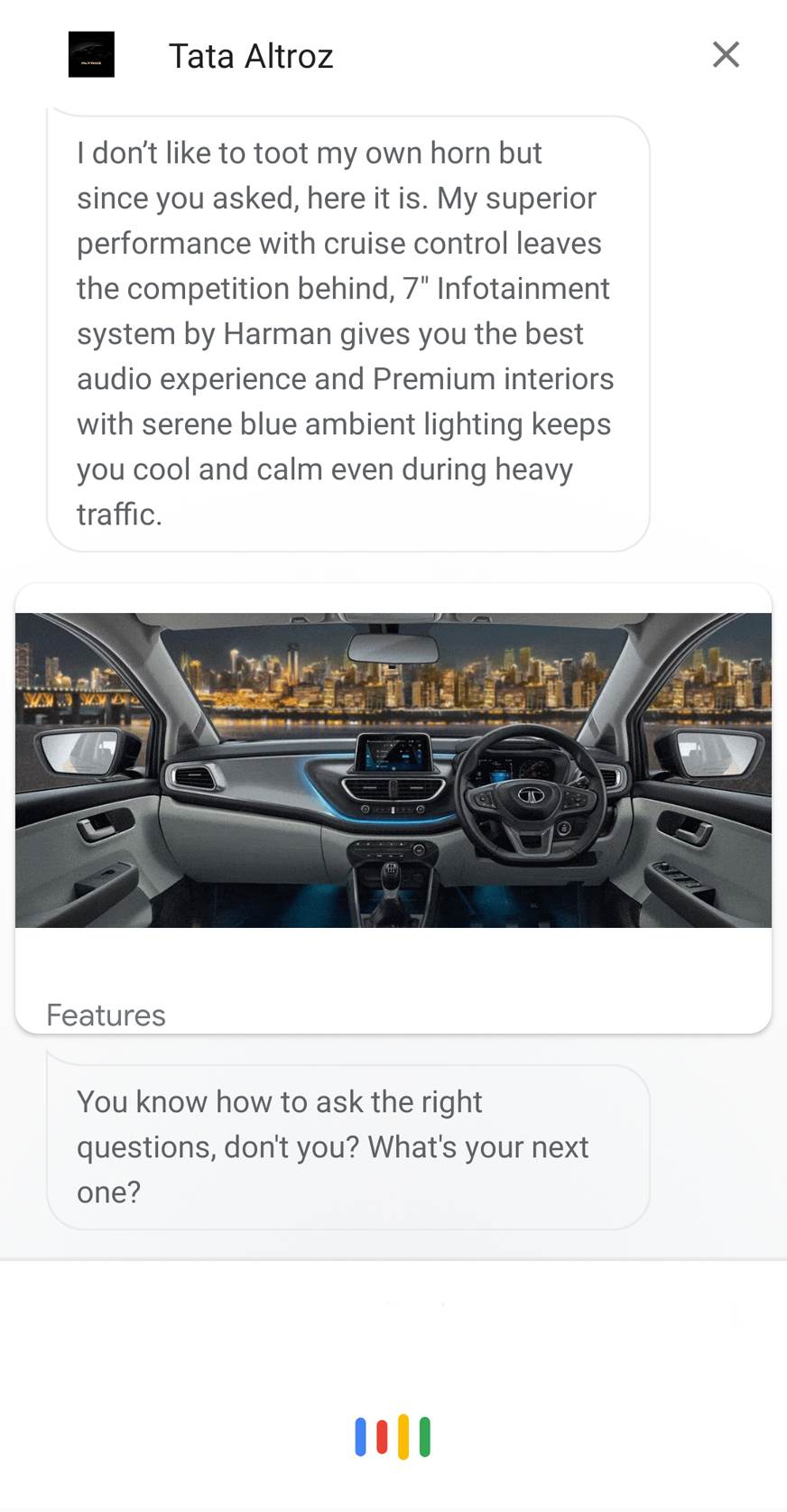 此服务将在任何具有Google Assistant的智能手机上工作。它涉及说“OK Google,与Tata Altroz交谈。”您是通过计算机化的声音迎接有关汽车尺寸的问题(它告诉我altro波动有345升的启动)以及将可用的功能。当我测试它时,它告诉我,“我不喜欢兜售自己的号角,但自从你问,这里是。”然后,助手将列出Harman-Sourced 7.0英寸触摸屏信息娱乐系统,高级室内设计与蓝色环境照明和巡航控制系统。