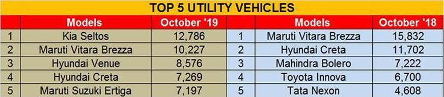 曾在9月份从现代场地夺回冠军,Maruti Suzuki Vitara Brezza在30天的跨度中向Seltos失去了它。Compact SUV销售额为10,227个单位,在4月至4月11日的11,785个单位和9月份的11,782个单位之后录得其第三次最佳月销量。Brezza 2019年4月至10月的累计销售额为62,437个单位,下降34%,同比(2018年4月 - 10月:94,869).Brezza至Maruti的重要性可以从2019年4月 - 10月占公司1,37,318个单位的UV销售额的45%的事实中收集。