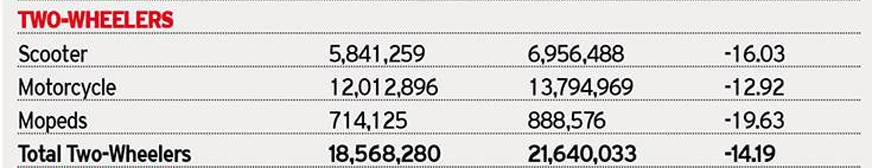 乘用车(PV)段继续崩溃,导致12.75%的坍落度持续29,62,052个单位(33,94,790); CVS下降了15%至8,54,759个单位(10,05,502);三轮车最佳,以4.36%的衰减为4.36%,以时钟6,86,944个单位(7,18,284),而两轮车继续看到下降趋势,14.19%下降至1,85,68,280单位(2,16,40,033 )。