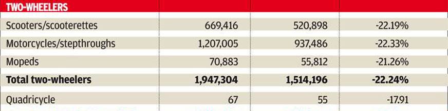 踏板车和摩托车,均由相似的水平下降,前者在5,20,898个单位(2018年8月:2018年8月)下销售额下降22.19%6,69,416)和后者观察到22.33%的跌幅,净销售额收于9,37,486单位(2018年8月:12,07,005).