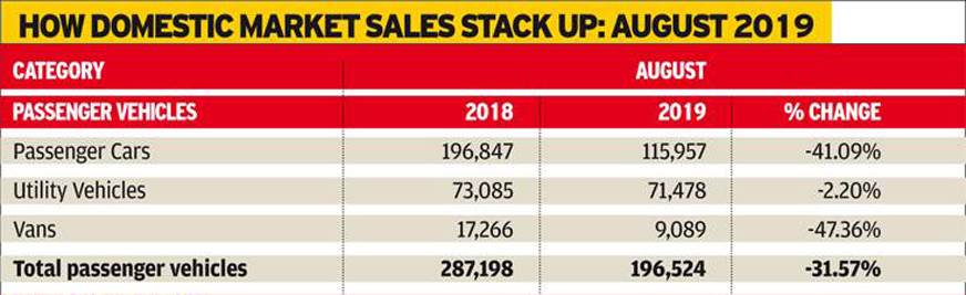 乘用车(PV)销售额,跌幅31.57%至1,96,524个单位(2018年8月:2,87,198)也达到了历史措施,乘用车在1,15,957个单位(2018年8月:1,96,847)并通过大规模滴41.09%。有趣的是,MG HECTOR和KIA SELTOS形式的新推出已经看到UV子类别略微改善,并达到2.20%的降低,紫外线销售总额为71,478单位(2018年8月:73,085).另一方面,货车继续在9,089个单位(2018年8月:17,266 / -47.36%)。