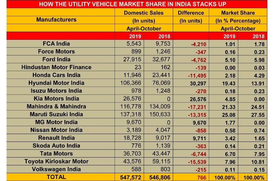 市场领导者Maruti Suzuki印度于2019年4月销售1,37,318辆,下降8.83%(2018年4月 - 10月:1,50,633)并且已经看到其UV市场份额从一年前从27.55%的27.55%降至25.08%。同样,强劲的第二名Mahindra&Mahindra在一年前的24.51%,它的份额从24.51%降至21.33%。2019年4月至10月的销售额为1,16,778个单位,Mahindra将其UV数字降至12.8%(2018年4月 - 10月:1,34,009).所有其他UV玩家都有单位紫外线市场份额;他们在审查期间看到了他们的销售和分享下降。