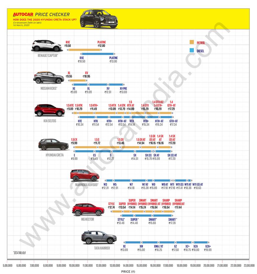 2020 Hyundai Creeta价格(前展厅)Variant1.5 Petrol-Mt1.5汽油 - CVT1.5柴油 - MT1.5柴油 - AT1.4 Turbo-Petrol-dctcreta E - RS 9.99 Lakh - Creta Exrs 9.99 Lakh- 11.49 Lakh - Creta SRS 11.72 Lakh-R级12.77 Lakh - Creta SXRS 13.46 Lakhrs 14.94 Lakhrs 14.51 Lakhrs 15.99 Lakhrs 16.16 Lakhcreta Sx(O)-RS 16.15 Lakhrs 15.79 Lakhrs 17.20 Lakhrs 17.20 Lakhs 17.20 Lakh