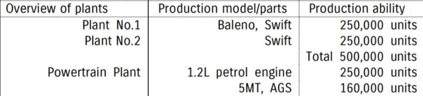工厂1号生产掀背车喜欢Baleno和Swift,而植物2号生产刚刚迅速。这两种植物都有250,000台的年生产能力,使铃木电机古吉拉特人总容量增加到5,00,000个单位。与Maruti Suzuki的生产能力一起为15万卢比,印度汽车的汽车的生产能力现在将成为20万卢比的呼气。