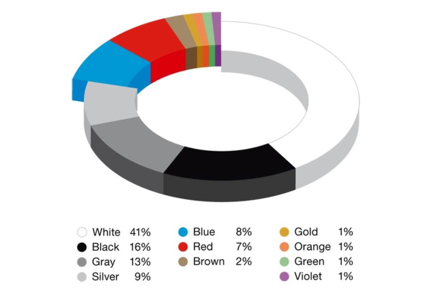 与之前的颜色报告相比,银的全球流行度略有下降。从可用的佩戴色调中,蓝色是最受欢迎的,其次是红色。这些色彩在较小的车辆区段内往往更受欢迎,同时在较大的段中对色度的总体要求降低。在这里,与上一年相比,黑白相当大的增加。
